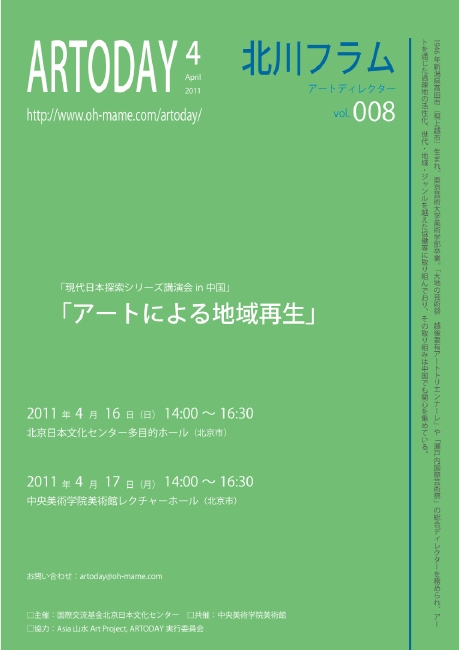 日期/地点:(两场内容相同) (1)4 月17 日(日)14:00~16:30 地 点:日本文化中心(北京市朝阳区建国门外大街甲6号SK大厦3层301) (2)4 月18 日(一)14:00~16:30 地 点:中央美术学院美术馆(北京市朝陽区花家地南街8号) 讲演者:北川 FRAM (艺术总监) 主 持:王璜生(中央美术学院美术馆馆长) 王春辰(中央美术学院美术馆学术部)